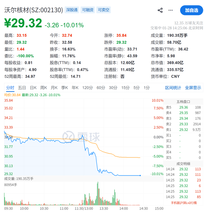 1月28日,沃尔核材午后突发跳水。截至发稿,沃尔核材报29.32元/股,跌幅为10.01%,卖一超9万手;总市值跌至369.4亿元,成交额超58亿元。