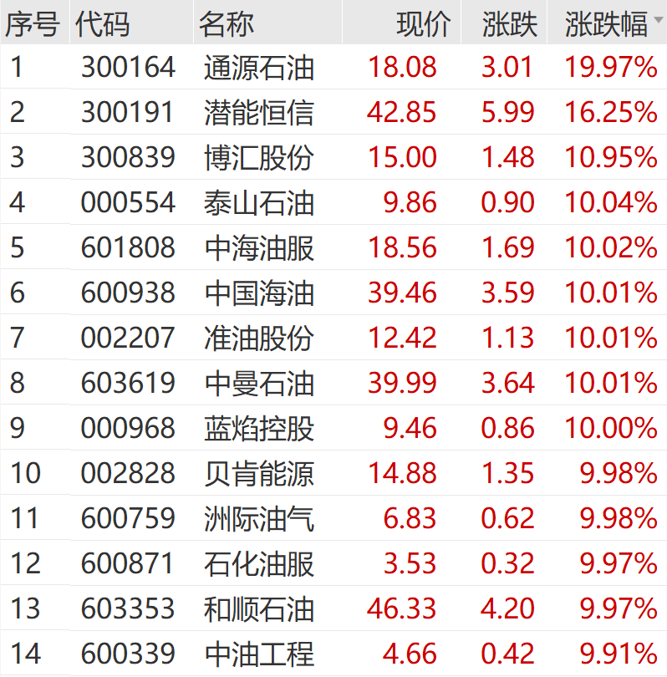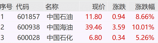 “三桶油”中,中国海油盘初涨停,中国石油涨超8%,中国石化涨超5%。