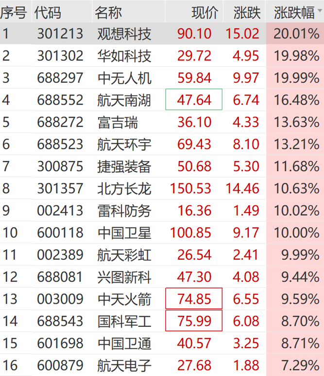 个股方面,华如科技、观想科技、中无人机20cm涨停,雷科防务、航天彩虹等涨停,北方长龙、航天南湖等涨超10%。