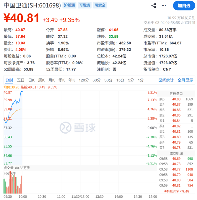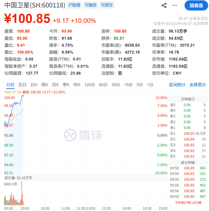 3月2日上午,国防军工板块整体拉升,军工信息化、卫星互联网、6G、商业航天等方向走强。