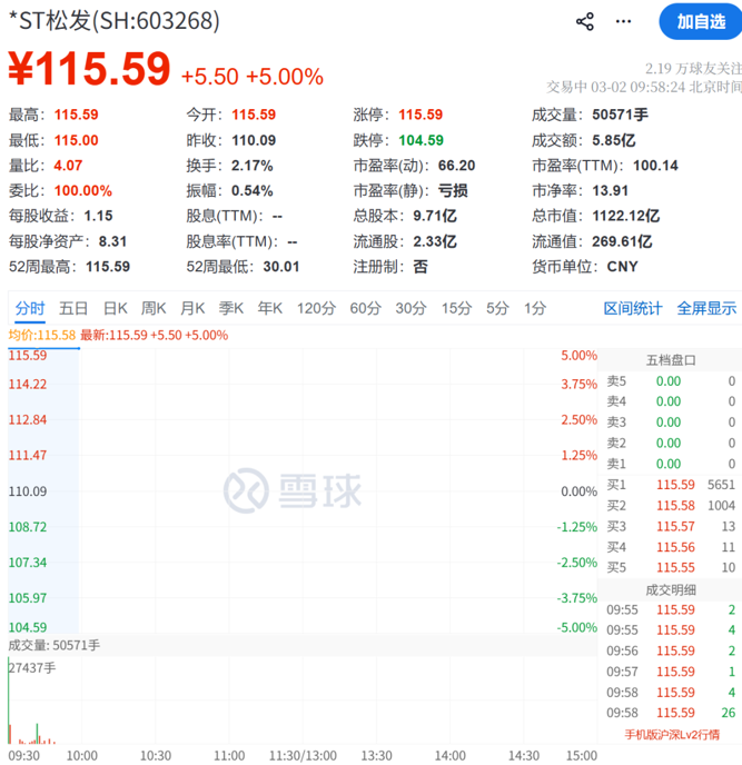 3月2日,*ST松发开盘涨停,报115.59元/股,实现“9天7板”。截至发稿,*ST松发仍保持一字涨停状态,总市值达1122亿元。