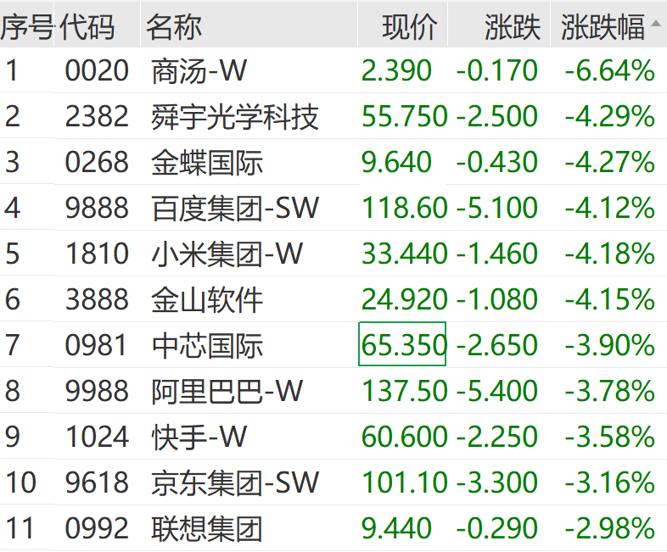 港股市场震荡走低,截至发稿,三大指数跌幅均超2%;科网股普遍不振,商汤跌超6%,领跌恒生科技指数成份股。