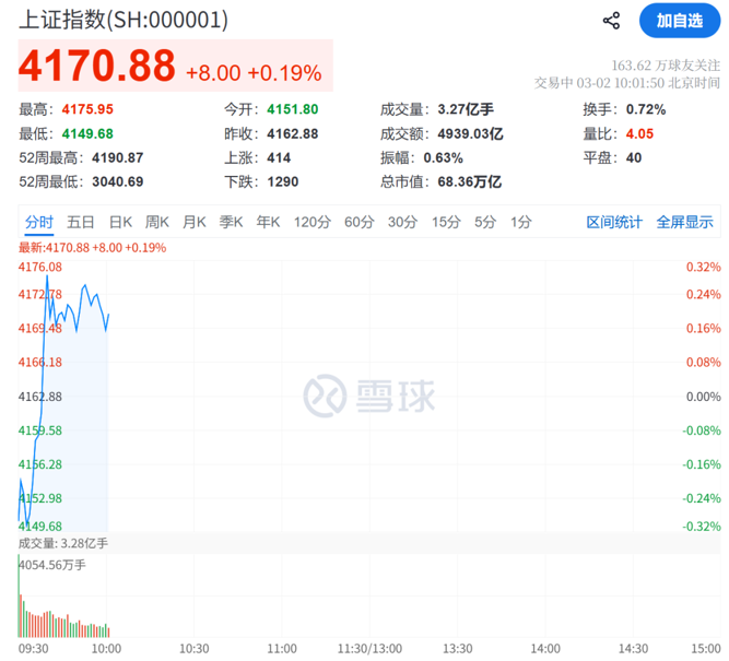 3月2日,A股市场主要指数早间集体低开:上证指数跌0.27%,深证成指跌1.16%,创业板指跌1.61%。开盘后沪指强势拉升翻红,截至发稿,上证指数涨0.19%,深证成指、创业板指跌幅明显收窄。