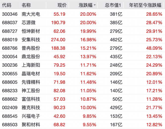 个股方面,芯源微、南大光电、恒坤新材录得20cm涨停,彤程新材、雅克科技、福晶科技录得10cm涨停。安集科技、普冉股份、鼎龙股份、上海新阳、神工股份、先锋精科、富信科技涨超10%。