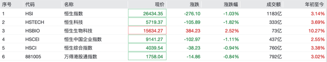 港股方面,在2026年开市大涨后,今天上午恒生指数、恒生科技指数、恒生中国企业指数等出现明显回调,跌幅均超1%。个股方面,腾讯控股跌超2%,阿里巴巴跌超3%,小米集团、比亚迪、网易、美的纷纷下跌。恒生生物科技逆市上涨,康方生物、和黄医药涨超5%,翰森制药、亚盛医药、科伦博泰生物、药明康德涨超3%。