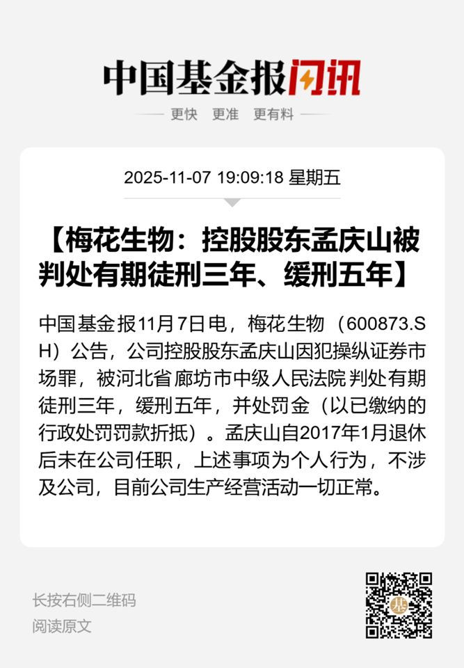 梅花生物11月7日晚公告,11月7日,公司接控股股东孟庆山书面通知,其收到河北省廊坊市中级人民法院出具的《刑事判决书》,判决如下:被告人孟庆山犯操纵证券市场罪,判处有期徒刑三年、缓刑五年,并处罚金(缓刑考验期限从判决确定之日起计算,罚金以已缴纳的行政处罚罚款折抵)。