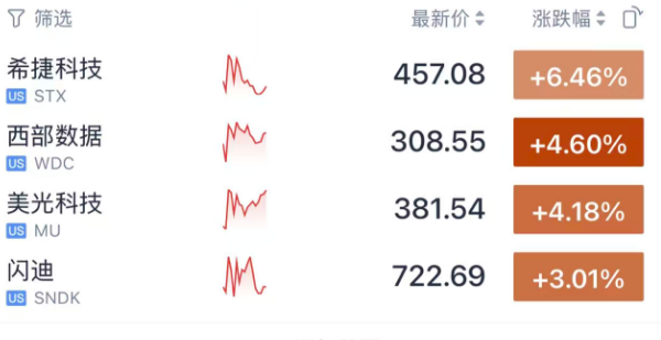 个股方面,存储芯片板块领涨。消息面上,摩根士丹利分析师Erik Woodring维持希捷科技买入评级,并将其目标价从468美元上调至582美元。根据TipRanks数据,该分析师近一年总胜率为59.8%,总平均回报率为19.0%。