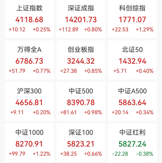 截至午间收盘,沪指报4118.68点,涨0.25%;深证成指涨0.8%,创业板指涨0.85%,科创综指涨1.29%。
