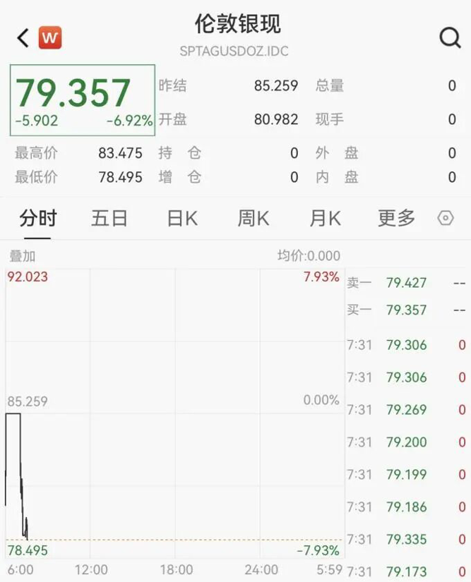 现货白银跌破79美元,最低价报78.495美元/盎司,日跌幅为7%。现报79.357美元/盎司,跌至1月9日左右水平。