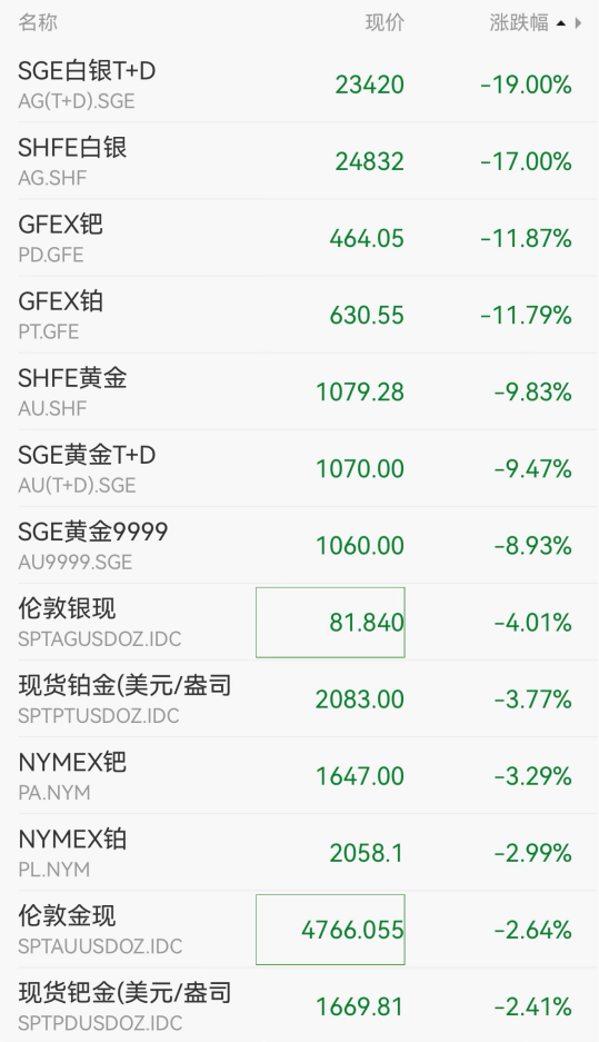 国际贵金属期货普遍重挫。