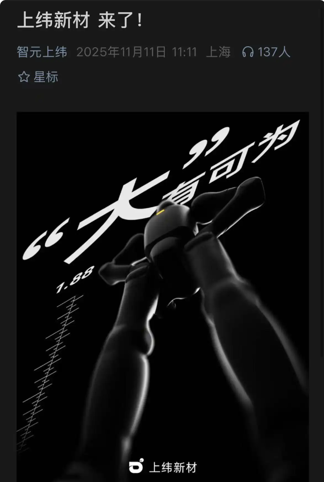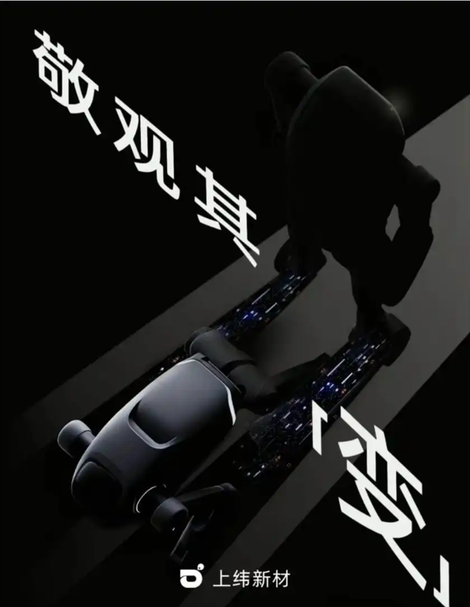 值得关注的是,11月11日,一个名为“智元上纬”的公众号上线,并发布一篇名为《上纬新材来了!》的文章。文章配有两张图:一张是写着“‘大’有可为”的1.88米高机器人,另一张是写着“敬观其‘变’”的四足机器人。相关内容被认为是上纬新材首发产品的预热海报。
