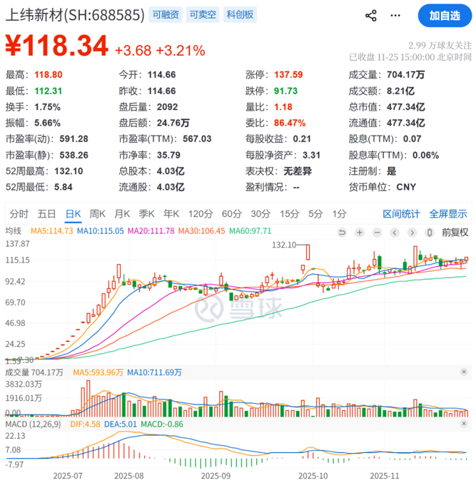截至11月25日收盘,上纬新材股价为118.34元/股,当日涨幅为3.21%,总市值为477.34亿元。