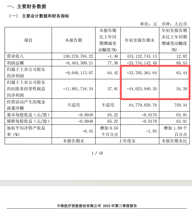 2025年前三季度,ST中珠的归母净利润、扣非后净利润分别为-3378.54万元、-4402.39万元,同比分别增长63.44%、54.38%。