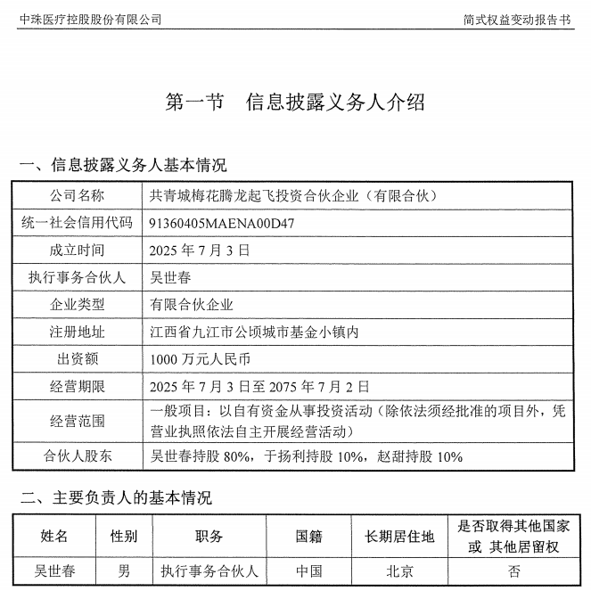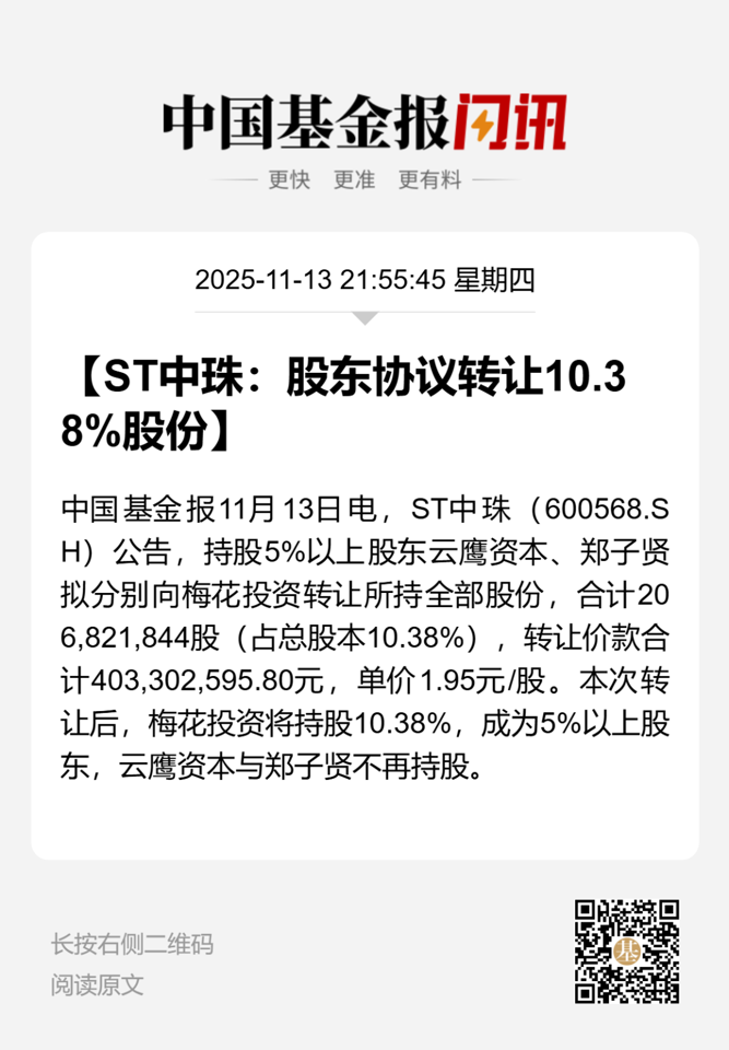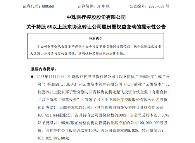 公告显示,11月11日,ST中珠持股5%以上股东广州云鹰资本管理有限公司(以下简称云鹰资本)、郑子贤,分别与梅花投资签署了《关于中珠医疗控股股份有限公司之股份转让协议》。