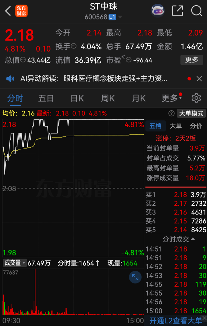 截至11月13日收盘,ST中珠股价报2.18元/股,涨幅达4.81%,总市值为43.44亿元。