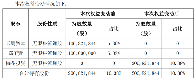 本次权益变动前,梅花投资未持有ST中珠的股份。本次权益变动后,梅花投资持有ST中珠10.38%的股份,云鹰资本、郑子贤不再持有ST中珠的股份。