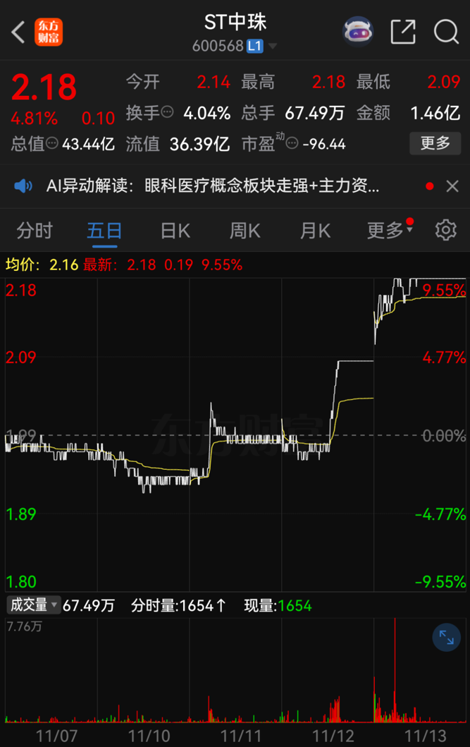 ST中珠在11月11日盘中出现股价异动,涨幅一度达4.64%,11月12日、11月13日均以涨停收盘。