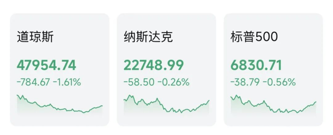 截至收盘,美国三大股指全线收跌,道指盘中一度深跌超1100点,收跌784.67点,跌幅为1.61%,报47954.74点;纳指收跌58.50点,跌幅为0.26%,报22748.99点;标普500指数收跌38.79点,跌幅为0.56%,报6830.71点。