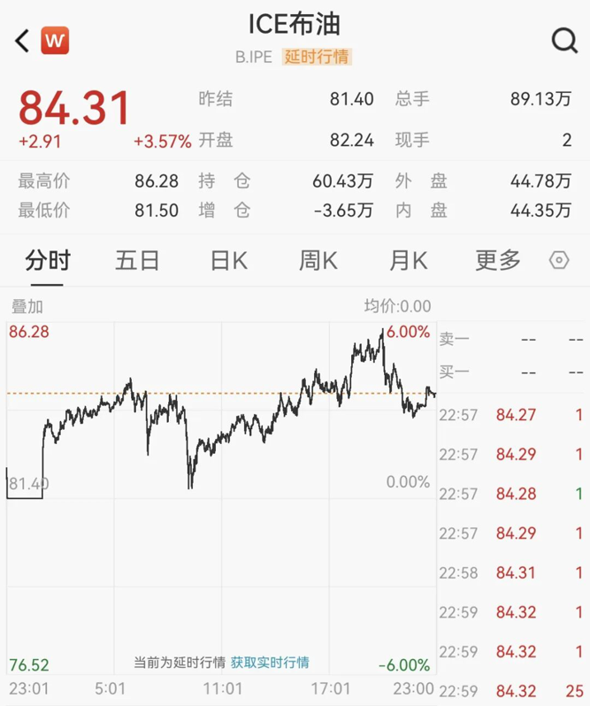 布伦特原油上涨3.57%,至每桶84.31美元。值得注意的是,布伦特原油价格本周以来已大涨超17%。