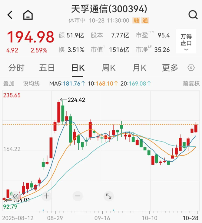 天孚通信涨2.59%,现报194.98元/股,最新市值为1516亿元,年初至今涨幅超200%。