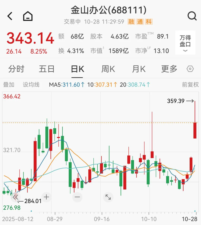 10月28日上午,金山办公股价涨超8%,现报343.14元/股,最新市值为1589亿元。