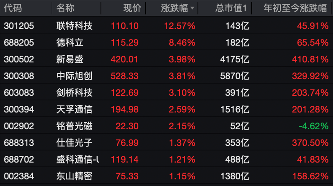 另外,联特科技涨逾12%,德科立、剑桥科技、仕佳光子、铭普光磁、光库科技等纷纷上涨。