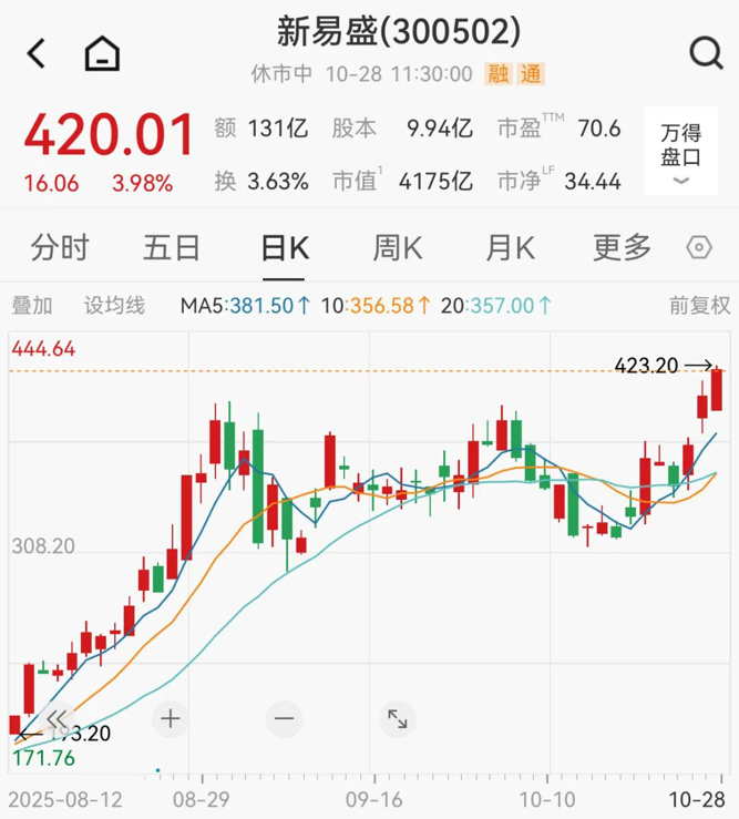 新易盛涨近4%,现报420.01元/股,最新市值为4175亿元,年初至今涨幅超400%。
