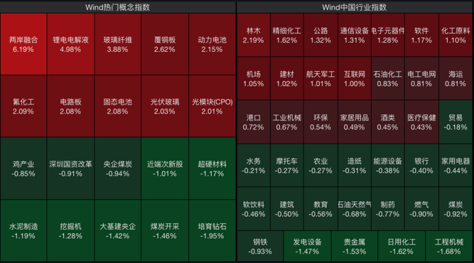 从板块看,人工智能、云计算板块领涨,两岸融合概念强势拉升,玻璃纤维、锂电电解液、光模块(CPO)、光芯片等概念板块涨幅居前,通信设备、电子元器件、林木、航天军工板块上涨;而贵金属、煤炭板块领跌,培育钻石、煤炭开采、水泥制造等概念个股回调。