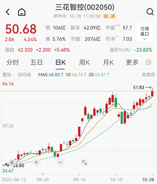 三花智控一度涨超6%,股价创历史新高,现报50.68元/股,最新市值为2076亿元。