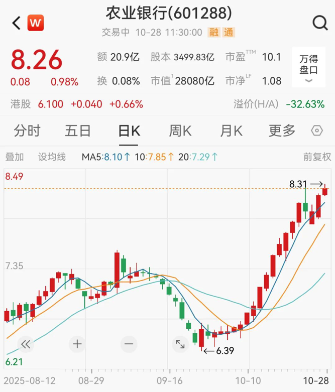 农业银行涨近1%,股价最高报8.31元/股,再创历史新高,现报8.26元/股。