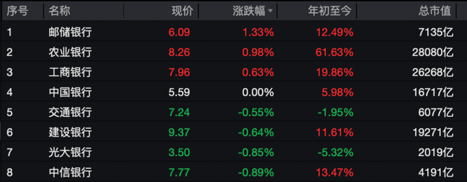 邮储银行涨1.33%,现报6.09元/股,工商银行涨0.63%;中信银行、光大银行、建设银行、交通银行股价下跌。