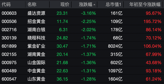 个股方面,盛达资源、招金黄金、湖南白银跌超2%,晓程科技、紫金矿业、湖南黄金、山金国际、中金黄金等纷纷回调。