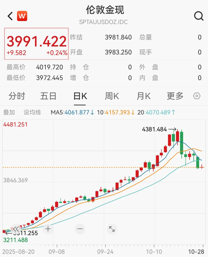 国际金价持续大幅震荡。截至发稿,现货黄金报3991.422美元/盎司,日内涨0.24%,日内最低跌至3972.445美元/盎司。