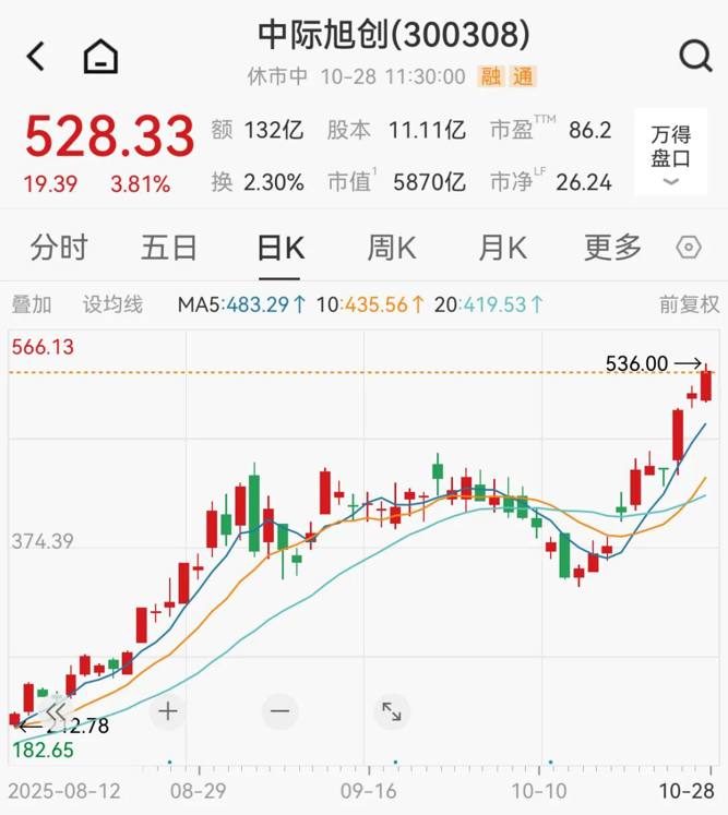 “易中天”大涨。中际旭创股价续创新高,上午一度涨超5%,现报528.33元/股,最新市值达5870亿元,年初至今股价涨幅超300%。