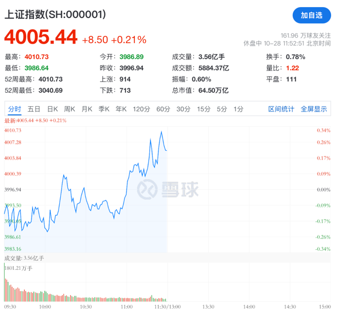 10月28日上午,A股三大股指低开高走,上证指数盘中冲破4000点整数关口,这是时隔十年上证指数重上4000点整数关口。