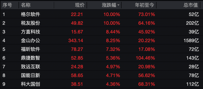 应用软件相关个股方面,格尔软件、税友股份录得10cm涨停,方直科技、福昕软件、致远互联、国能日新、科大国创等涨幅均超3%。