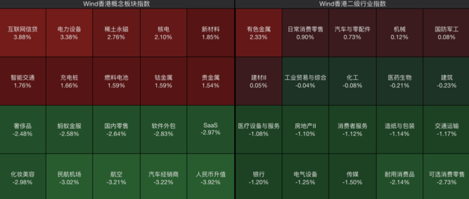 板块上来看,港股核电板块走强,贵金属概念股集体大涨,锂电池、汽车及其产业链板块表现活跃;半导体、可选消费、房地产等板块震荡调整。