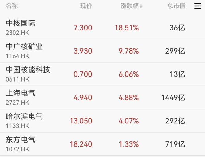 港股核电板块走强,中核国际一度大涨20%,中广核矿业涨超9%,上海电气、哈尔滨电气、东方电气等跟涨。