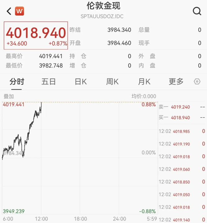 消息面上,现货黄金站上4010美元/盎司,现涨0.87%。