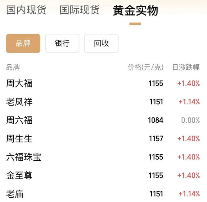国内多家黄金珠宝品牌金饰价格持续攀升,周生生足金饰品涨至1157元/克,周大福、六福珠宝、金至尊足金饰品涨至1155元/克。