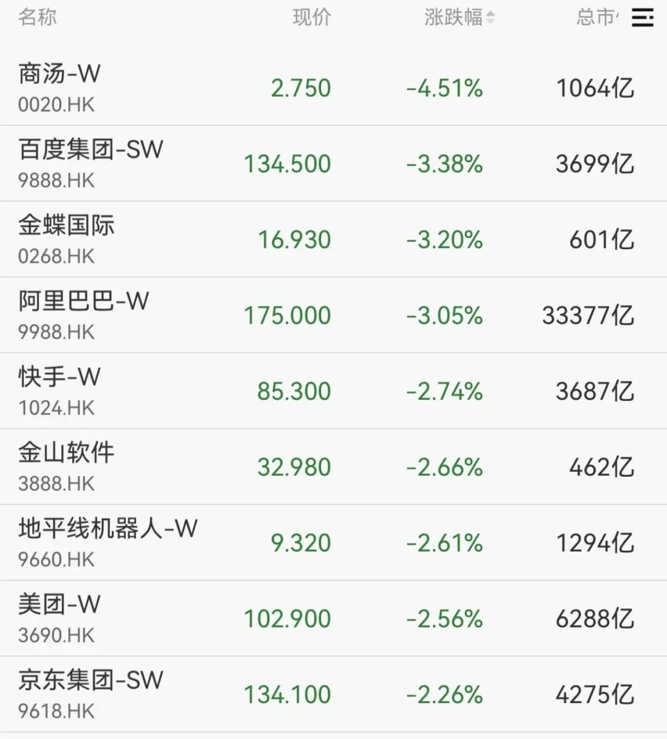 个股方面,商汤跌超4%,百度集团、阿里巴巴、快手等跌幅居前。