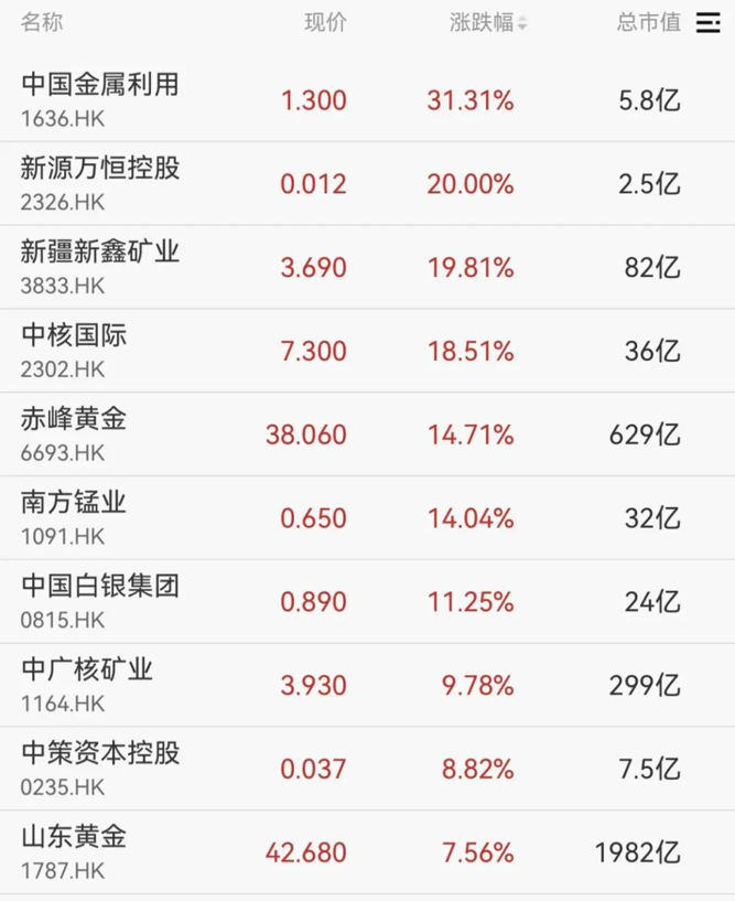 受益于黄金价格走高,贵金属板块持续大涨,中国金属利用涨超30%,新疆新鑫矿业、赤峰黄金、山东黄金等多股大涨。