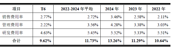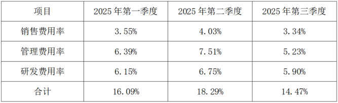 截至2025年第三季度,思泉新材营收为6.7亿元,同比增长57.93%;2024年全年营收为6.56亿元,同比增长51.10%。这意味着,随着营收快速增长,费用率也在快速增长,由2023年的11.29%增至2024年的13.26%,再增至2025年前三季度的16.07%(上图是2025年单个季度的期间费用率)。