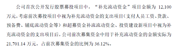 值得注意的是,在思泉新材首发募集资金项目中,补充流动资金的实际金额达到2.17亿元,占总募集资金的比例达到36.12%,已经超过了相关规定中“用于补充流动资金和偿还债务的比例不得超过募集资金总额30%”的红线。