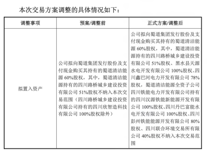 调整后,公司拟向蜀道集团发行股份及支付现金购买其持有的蜀道清洁能源60%股权,其中,蜀道清洁能源持有的四川路桥城乡建设投资有限公司51%股权、黑水县天源水电开发有限公司100%股权等不纳入本次交易范围。本次交易方案调整不构成重大调整。
