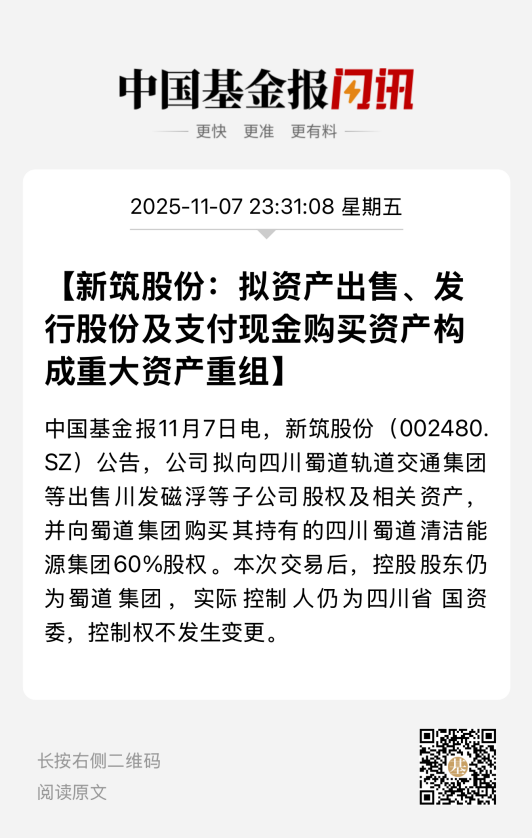 11月7日,新筑股份公告称,公司拟13.92亿元出售川发磁浮等子公司股权及相关资产,并以58.14亿元购买蜀道清洁能源60%股权,本次交易构成重大资产重组。
