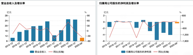 2021年至2024年,公司归母净利润分别为-2.33亿元、-5.66亿元、-3.42亿元和-4.09亿元,合计亏损15.5亿元;公司2025年前三季度亏损额则为4229.18万元。