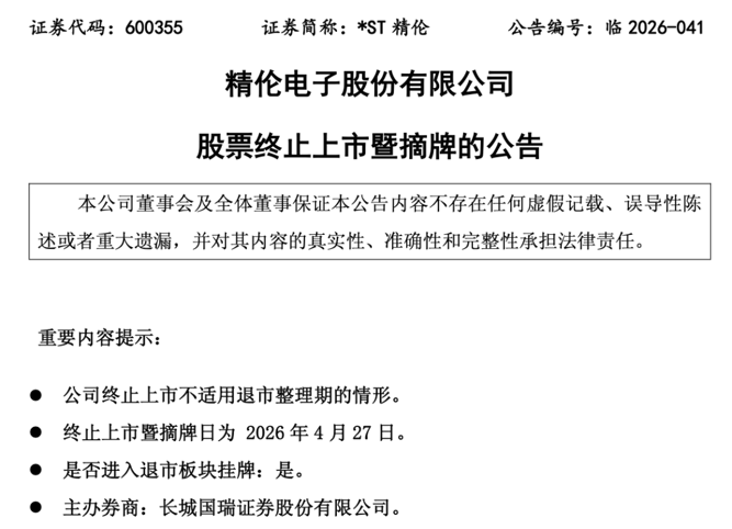 4月20日,*ST精伦发布《精伦电子股份有限公司股票终止上市暨摘牌的公告》。