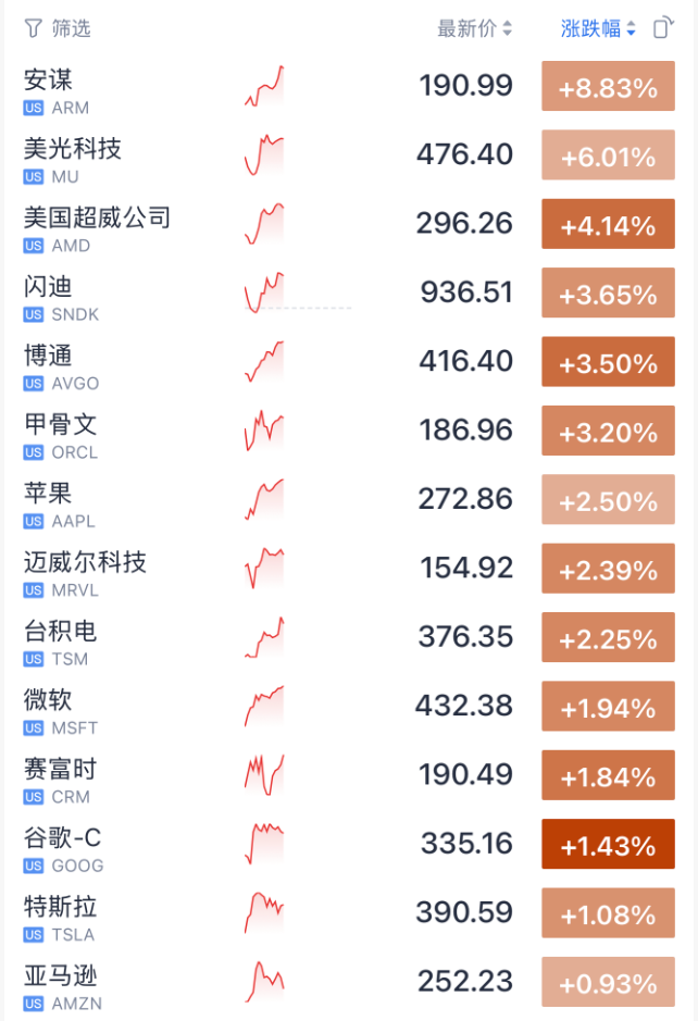 科技股集体大涨,存储芯片巨头美光科技涨超6%。