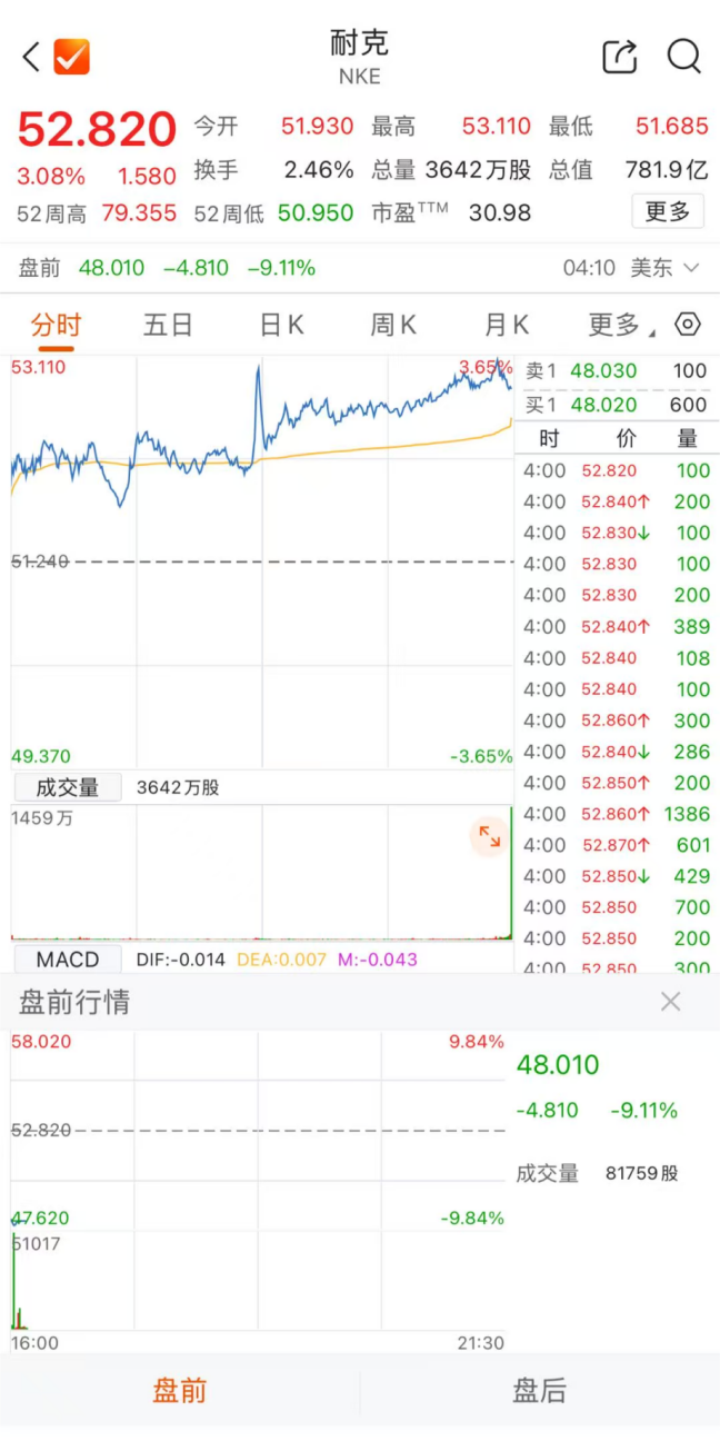 在公司发布第四季度销售额将下滑的预警后,4月1日,耐克美股盘前跌超9%。